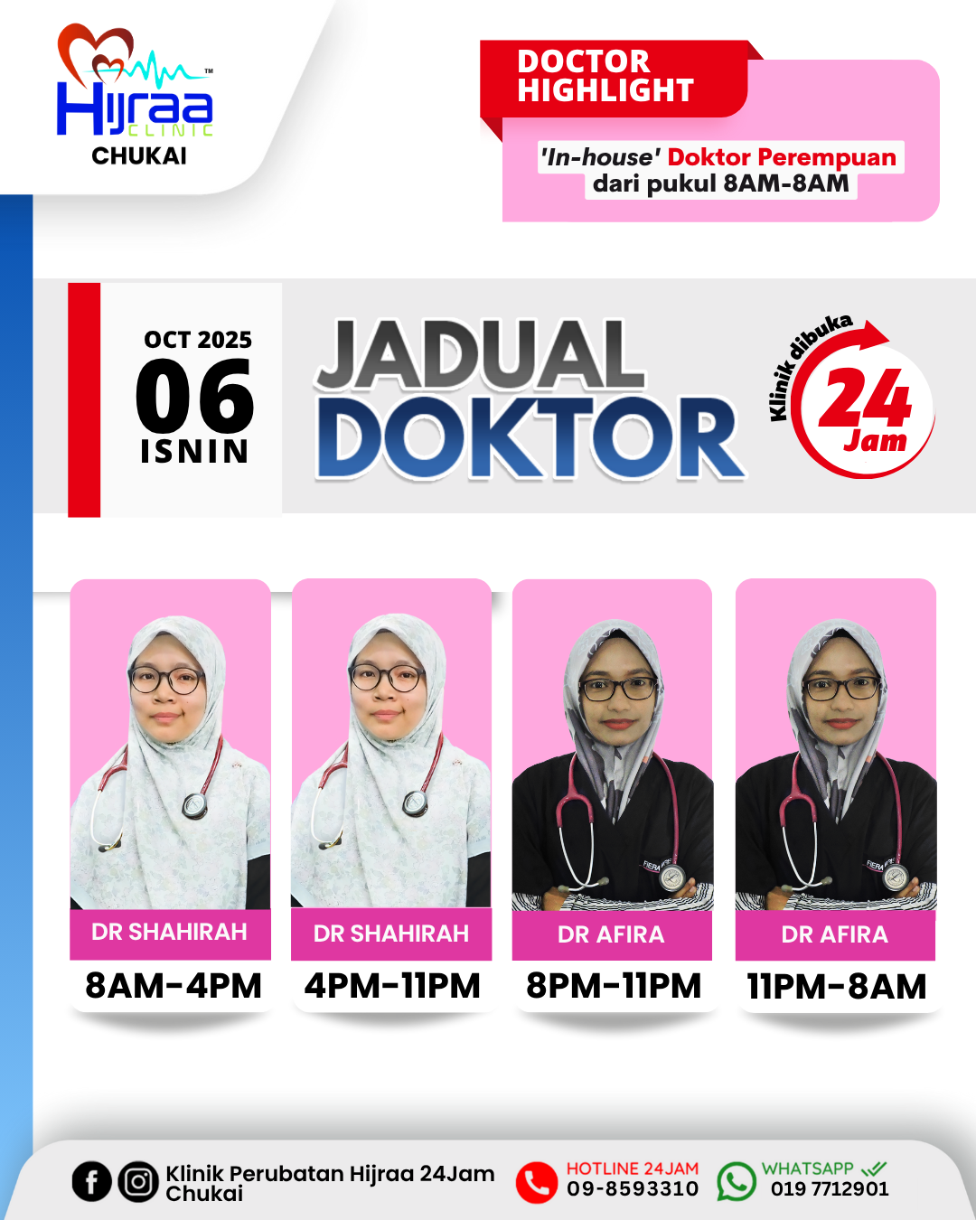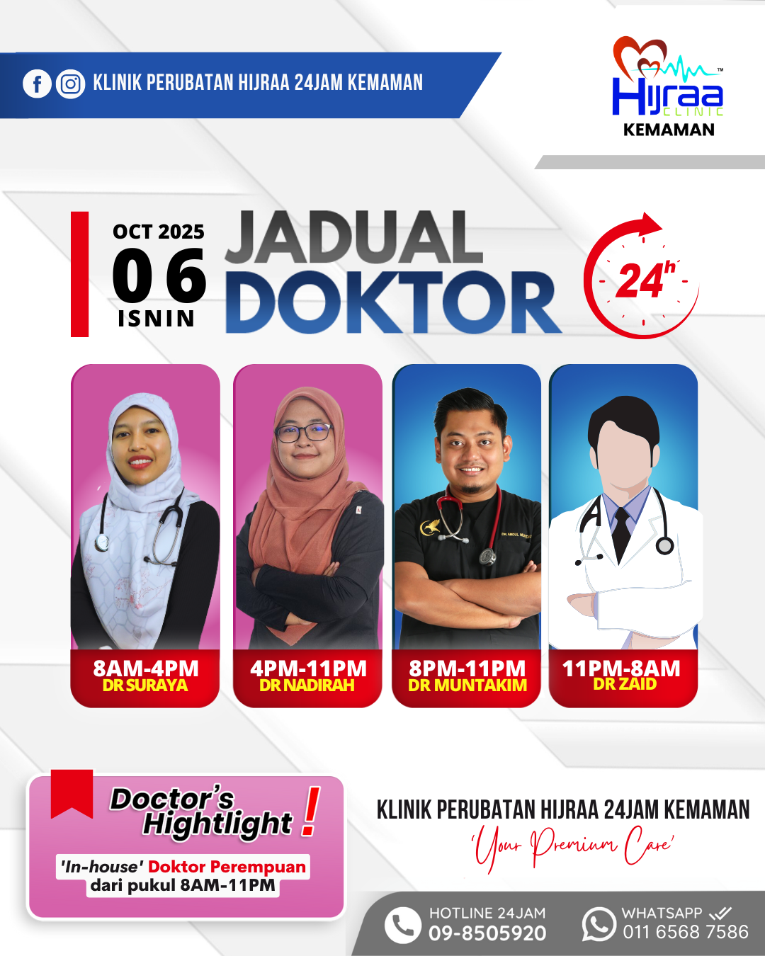 Klinik Perubatan Hijraa menyediakan perkhidmatan premium dengan fokus pada kesejahteraan kesihatan. Kami sentiasa komited untuk menyokong gaya hidup yang sihat. Kini kami hadir dengan 2 cawangan iaitu Klinik Perubatan Hijraa 24 Jam Kemaman dan Klinik Perubatan Hijraa 24 Jam Chukai. Kami juga menyediakan jadual doktor yang bertugas untuk rujukan anda dan memastikan kesediaan perkhidmatan kesihatan yang optimal.
