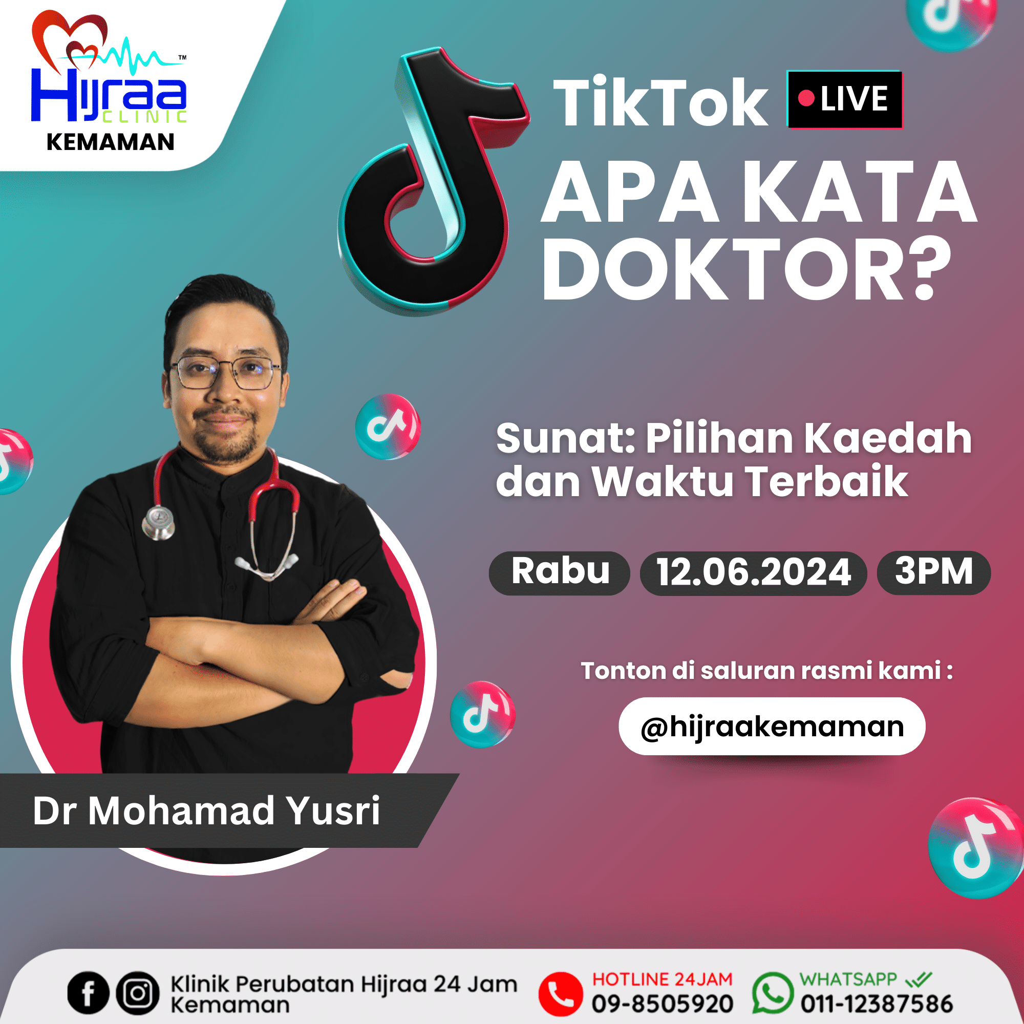 Jom saksikan live pertama kami di platform TikTok kami, bersama doktor residen Klinik Perubatan Hijraa 24 Jam Kemaman : Dr Mohamad Yusri di tetapan berikut : Platform : Tiktok Tarikh : 12.06.2024 (Rabu) Waktu : 3PM Topik yang akan dikupaskan adalah mengenai Kaedah Sunat Pilihan dan Waktu Terbaik untuk anak anda bersunat. Jadi ibu bapa […]